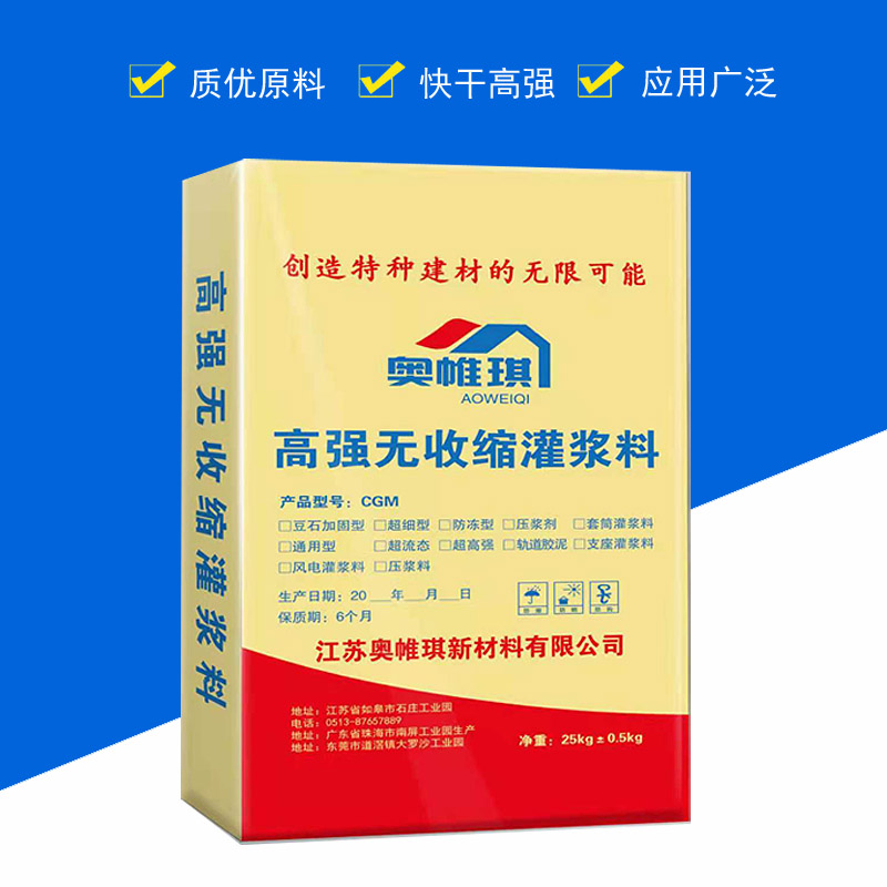 5、采用重力灌漿方式,將拌和后料漿均勻倒于處理好的基面上,灌漿過(guò)程應(yīng)從支座中心部位向四周注漿,自流平即可。也可從一側(cè)灌入,直至另一側(cè)溢出,以利于排出機(jī)座與混凝土基礎(chǔ)之間的空氣使灌漿充實(shí)。為使空氣順利排出,不得從四側(cè)同時(shí)進(jìn)行灌注。結(jié)構(gòu)復(fù)雜、空間很小且距離較遠(yuǎn)時(shí),可采用“高位漏斗法”或“壓力法”進(jìn)行灌漿。 產(chǎn)品包裝 復(fù)合袋包裝,每袋含量50kg。